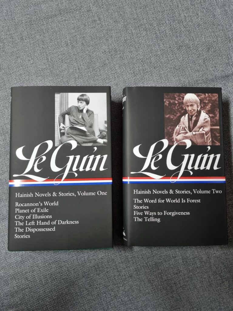 Tatsächlich ja, zumindest wenn ihr auf Englisch lesen und möglicherweise sogar alle der Hainish-Werke lesen wollt. Die Non-Profit-Organisation „Library of America“ hat einen schmucken Schuber mit zwei Hardcovern veröffentlicht, in dem sämtliche Hainish-Werke, Le Guins Vor- und Nachworte und weitere Begleitmaterialien (z.B. Karten, enzyklopädische Dokumente und Kurz-Essays) enthalten sind. Unter der ISBN 978-1-59853-537-2 bekommt ihr (je nach Händler) für etwas über 50 € auf 1921 Seiten quasi das Rundum-Sorglos-Paket. Diese Ausgabe habe ich oben auch abgebildet. Alternativ sind die Einzelwerke und Anthologien auch alle als E-Book verfügbar, aber so weit ich sehen kann eben nicht gesammelt.